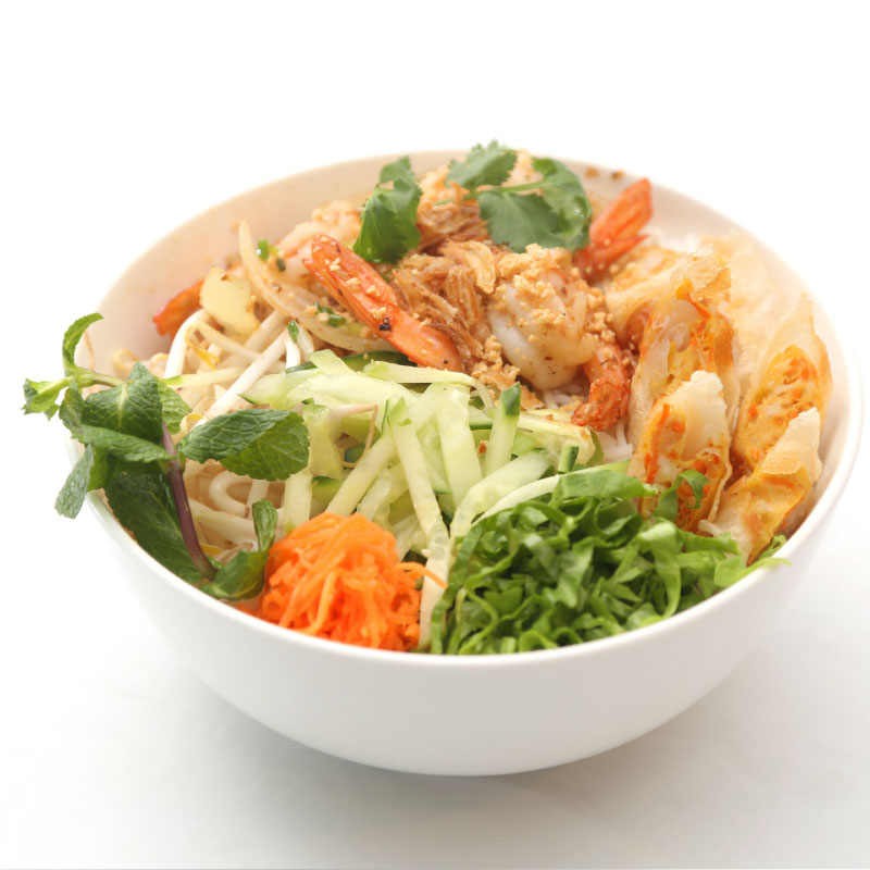 Vermicelles, nêm végétarien, salade, soja, concombre, carottes